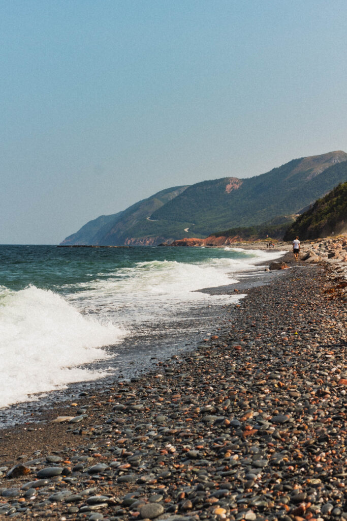 I woke up in a random trailer Airbnb in the middle of Nova Scotia, scouted my stops for the day, and started driving. I drove up around the tip and made my way back down, of course stopping and taking a million pictures as I went. The landscape shifted dramatically on the Western side as opposed to the Eastern, the rocky outcrops and craggy cliffs became lush rolling mountains and pebbly beaches. The water was deceiving, looking almost tropical, while being utterly frigid.